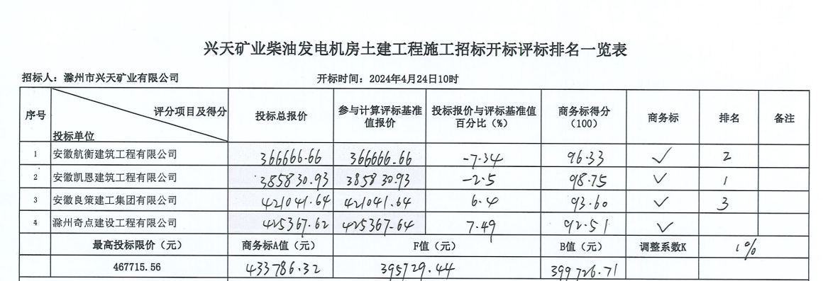 | 第一中標候選人 | 投標人名稱 | 安徽凱恩建筑工程有限公司 | |