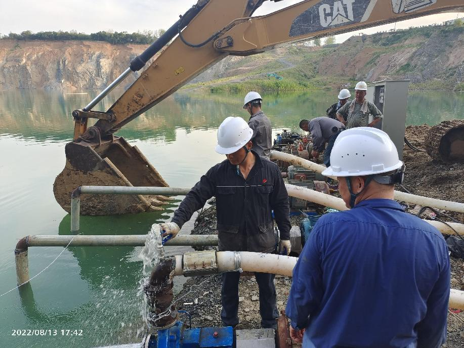 抗旱方案有了,可是要想把水從70米深的礦坑內(nèi)抽到地面,不但需要揚(yáng)程特別高的水泵,還需要高規(guī)格長距離的水管和電纜,還有很多配套零部件要采購。旱情就是命令,抗旱就是責(zé)任,興天礦業(yè)副總經(jīng)理趙崗牽頭落實(shí)抗旱物資采購,親自指揮設(shè)備調(diào)運(yùn)安裝,帶領(lǐng)公司抗旱突擊隊(duì)和社區(qū)干部深入礦坑,一起研究水泵需要多大功率安裝在什么地方、水管需要多粗從哪里下放、電纜需要多長從哪里接電等問題。方案制定好了,老百姓的水稻不能等,挖掘機(jī)第一時間進(jìn)場整理場地,興天礦業(yè)和社區(qū)準(zhǔn)備的水泵、水管電纜等也迅速到位,抗旱突擊隊(duì)與社區(qū)干部群眾一起與時間賽跑,從早到晚緊張施工,一心想著的就是早點(diǎn)把水抽上去,盡量把旱情影響降到最低。