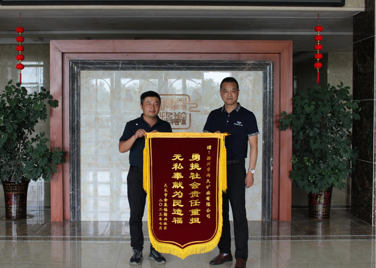 7月17日,天長市金集鎮(zhèn)諭興社區(qū)將一面印有“勇挑社會責任重擔,無私奉獻為民造福”的錦旗送到了興天礦業(yè)。